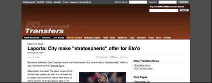 Soccernet(http://soccernet.espn.go.com/news/story?id=657760sec=transferscc=5739)在他们的文章页面中很好的使用了留白,你可以看出文字都离其它元素有一定的距离,从而提高了可读性。